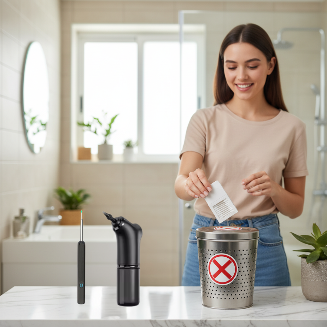 🔹 FlushClean – ערכת שטיפת אוזניים עם סילון מים עדין ו־4 מצבי לחץ, שמתאימה לכל גיל ונועדה לשימוש קל ובטוח בבית.